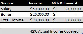 4). Income Insured: Your typical group plan only insures salaried income only, not usually income from commissions or bonuses. I occasionally see commission income covered and even less frequently bonuses insured. If you derive a significant portion of your income from bonus or commission and your group disability plan offers you 60% of salary covered, you may not be getting 60% of your income insured. For example: